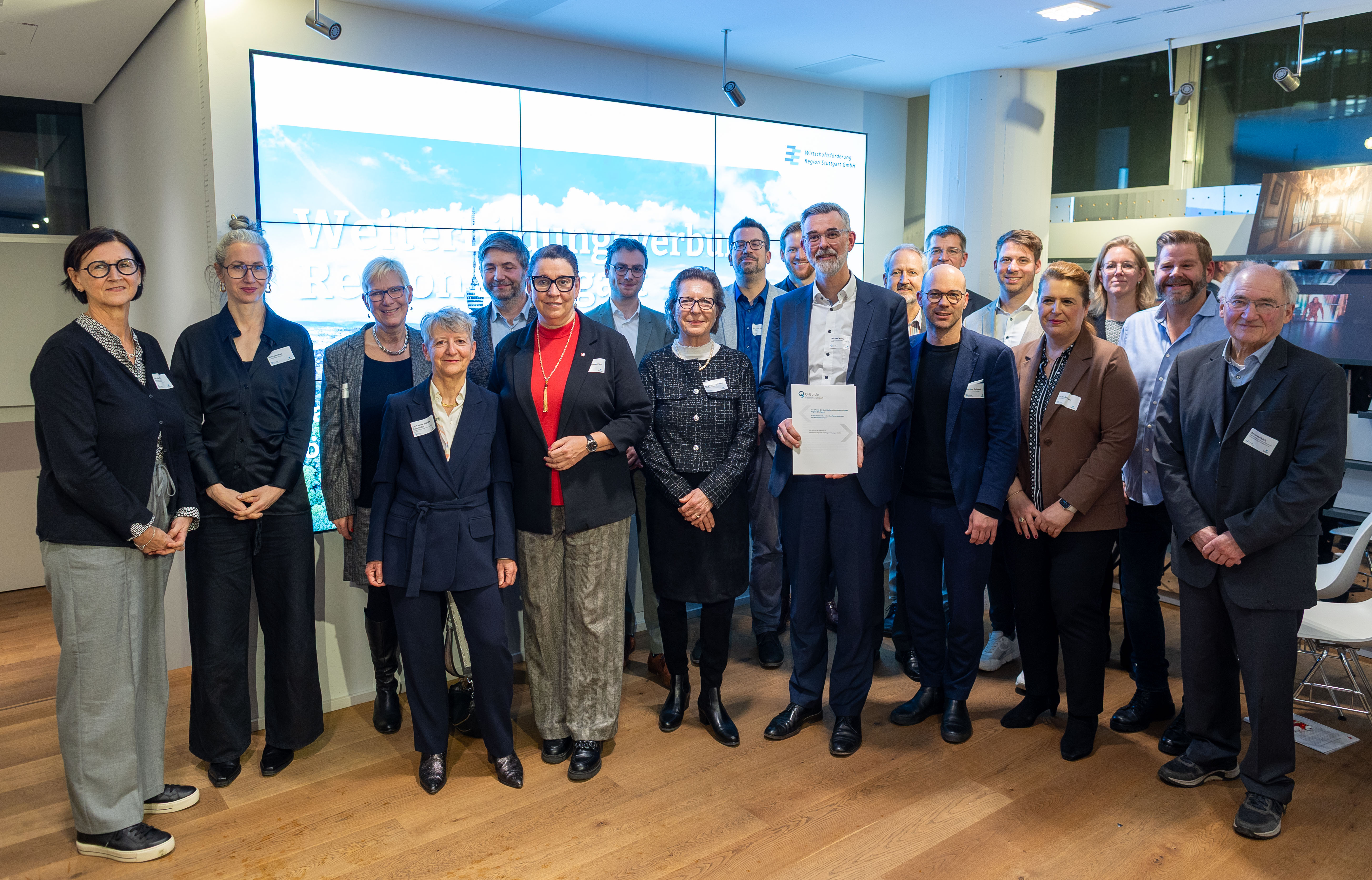 Zum Abschluss des Jahres 2026 kamen die Partner des Weiterbildungsverbunds Region Stuttgart (WBV) sowie Politikerinnen und Politiker aus Bund und der Region Stuttgart am 10. Dezember 2025 im „Gutbrod“, der Wirtschaftsförderung Region Stuttgart zusammen. Gemeinsam zogen sie Bilanz, eröffneten Perspektiven für 2026 und demonstrierten, wie der WBV den Wandel aktiv gestaltet. Die wichtigste Grundlage dafür: die Charta 2.0. „Im Strukturwandel auf Zukunftskompetenzen und Mentalität setzen!“ Das „Selbstverständnisdokument“ des WBV, das in einer gegenüber 2022 überarbeiteten Version vorliegt, wurde vorgestellt und von den Unterzeichnenden von allen Seiten bekräftigt. Katja Mast, Erste Parlamentarische Staatssekretärin im Bundesministerium für Arbeit und Soziales, ordnete den WBV und die Charta 2.0 aus Sicht des Bundes als „Goldstandard“ ein und tauschte sich mit dem Publikum zu Weiterbildung, Förderung und Fachkräftesicherung aus.