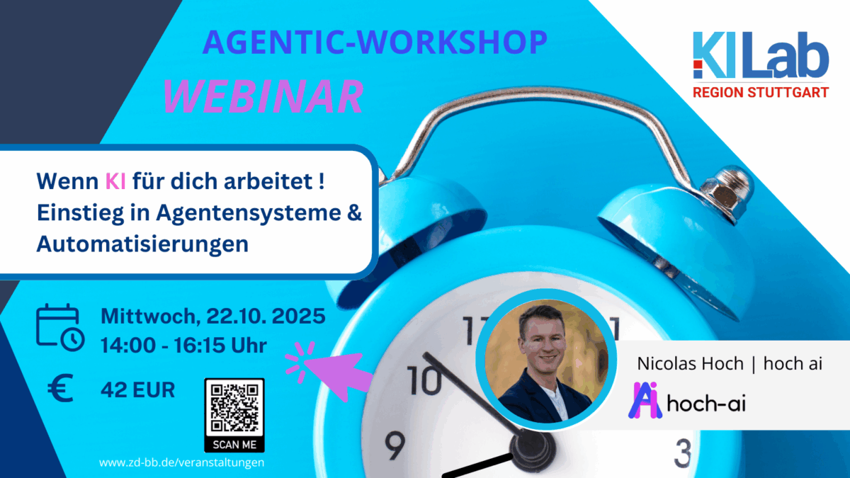 22.10.2025, 14:00 - 16:15 UhrDie strategische Nutzung von Künstlicher Intelligenz (KI) bietet kleinen und mittleren Unternehmen (KMU) eine hervorragende Gelegenheit, ihre Effizienz zu steigern, Kosten zu senken und neue Wachstumsmöglichkeiten zu erschließen – ein entscheidender Vorteil im Wettbewerbsumfeld. KI entwickelt sich rasant weiter – nach ChatGPT rücken nun sogenannte Agentensysteme in den Fokus. In diesem kompakten Online-Workshop erhalten Sie einen fundierten Überblick darüber, wie solche Agenten funktionieren. Wir zeigen, wo sie im Mittelstand bzw. kleinen und mittleren Unternehmen bereits erfolgreich eingesetzt werden und welche Tools sich für erste Schritte eignen. Die WRS ist Netzwerkpartnerin des KI-Labs im ZD.BB.